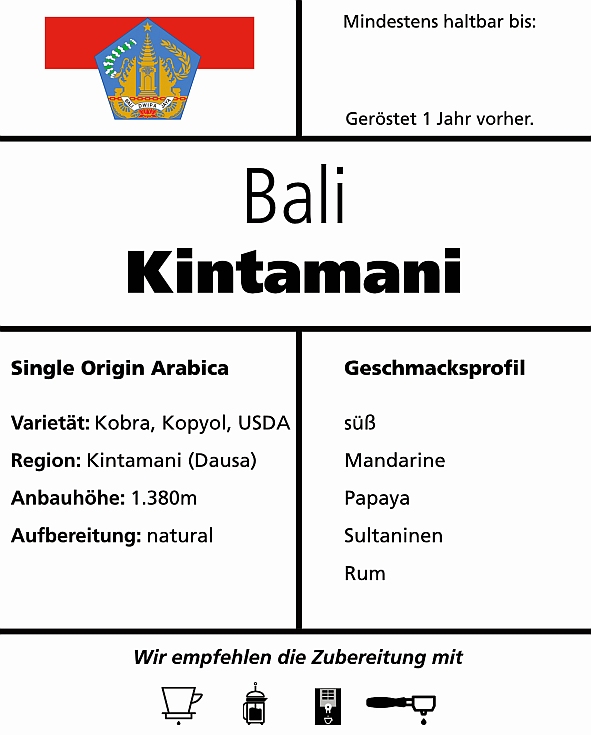 Es handelt sich um einen "Natural" aufbereiteten Arabica aus den Varietäten Kobra, Kopyol und USDA, der nach der Balinesischen Philosophie "Tri Hita Karana" – der Harmonie zwischen Mensch, Natur und dem Göttlichen – angebaut wird. Nach der Ernte werden die Kirschen langsam über 16 Tage in der Bergluft getrocknet, was diesem Kaffee seinen unverwechselbaren Charakter verleiht.